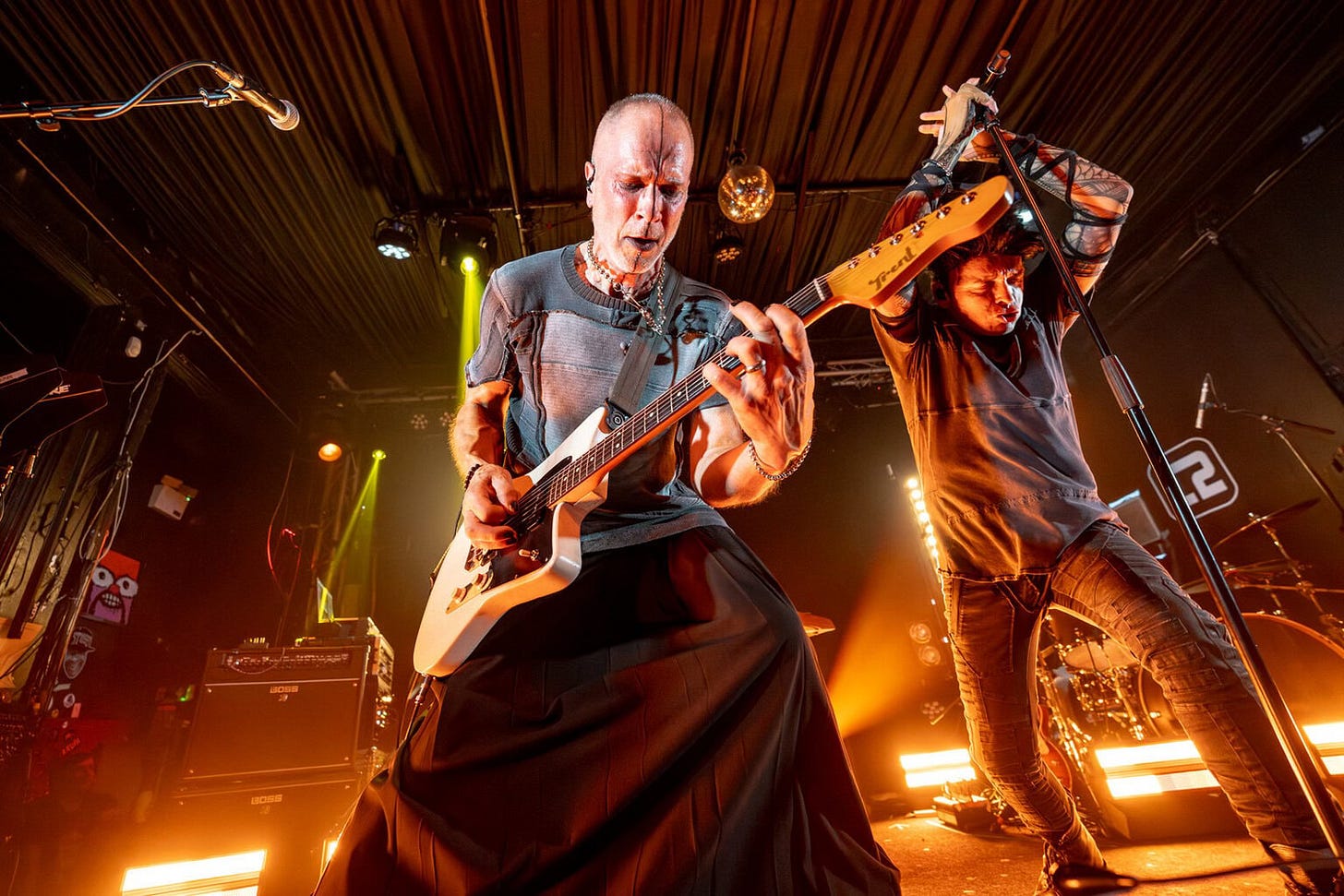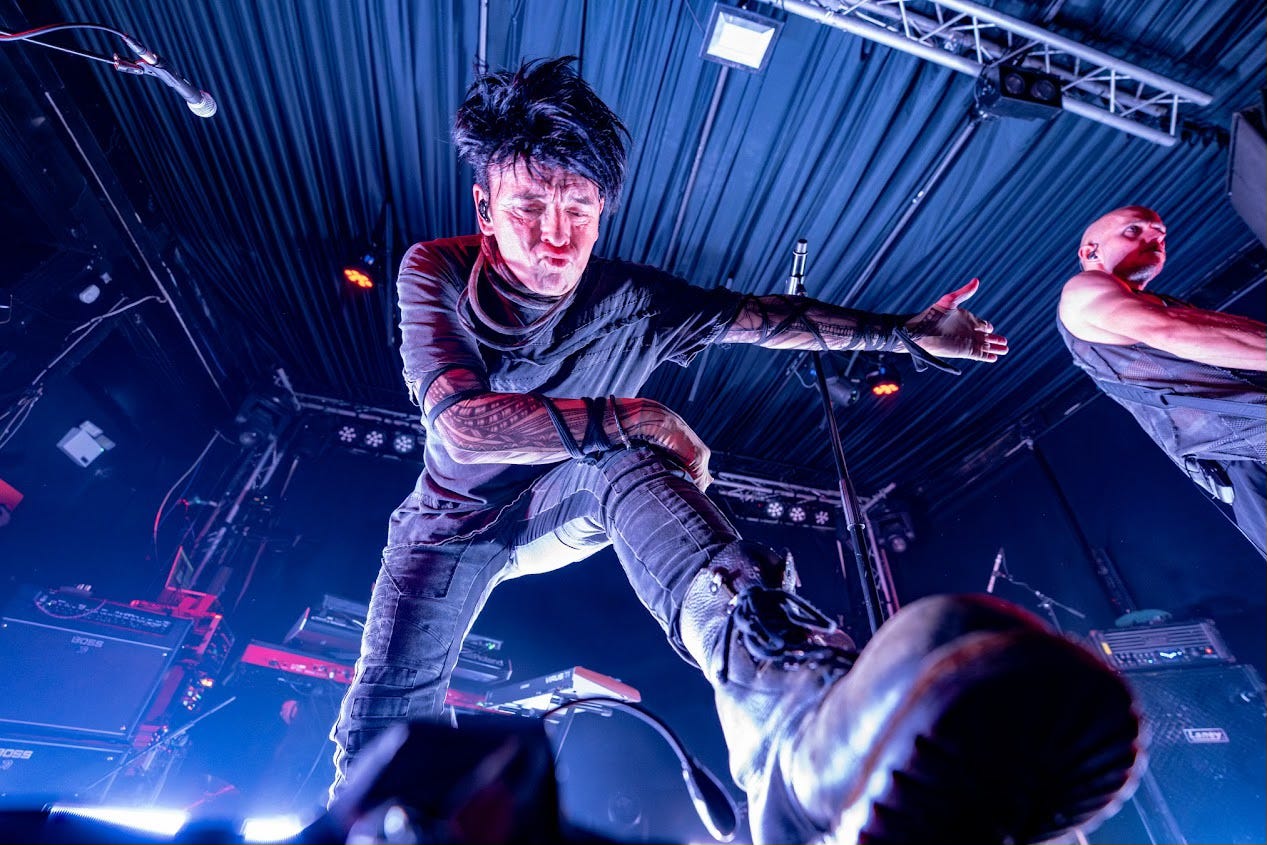 The sound is a wall pressing against your throat: razor-sharp synths, riffs drawn by laser, drums pounding like a factory in revolt. The band moves like a small army of cyber-Egyptian priests: choreographed gestures, blank stares, ritual signs that turn the stage into an altar. Numan doesn’t just sing—he conjures. Pure becomes an anthem of survival, Cars a mythological bridge to a past that refuses to die, while My Name Is Ruin, with Persia, burns the crowd like a warrior mantra.